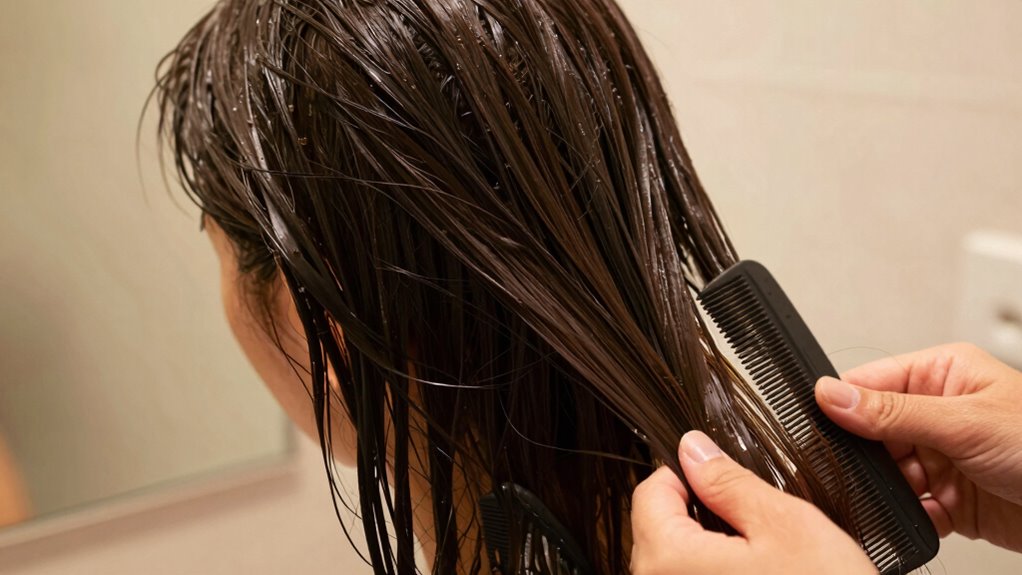 Keep in mind, a quality wide-tooth comb distributes pressure evenly, minimizing damage. Switch to a detangling brush if you prefer a different grip, but always choose tools designed for wet hair. This approach keeps your strands healthy and smooth.