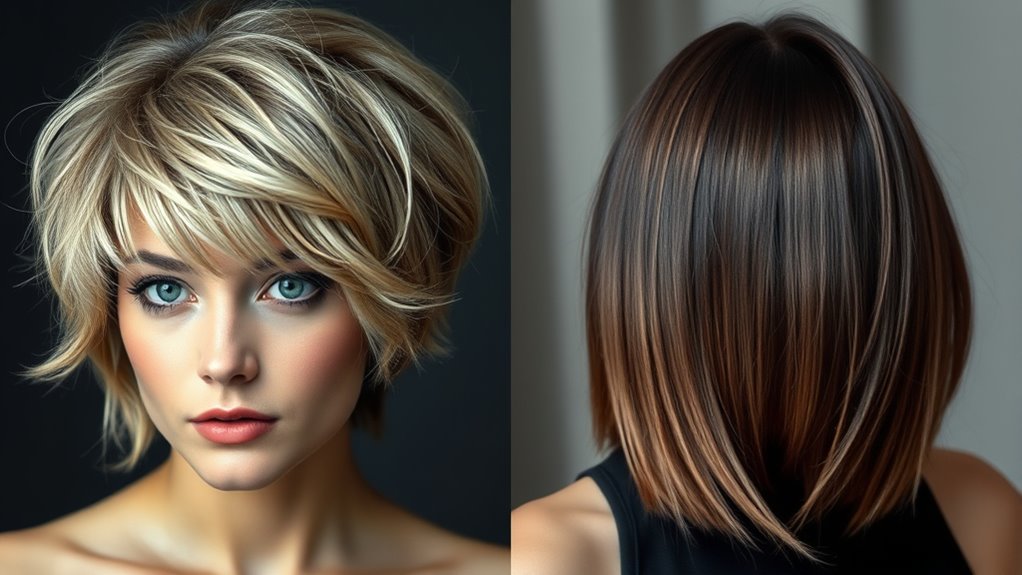 To smoothly switch between these cuts, you need to play it by ear and use blending techniques to soften the changeover. Start by trimming or layering to create harmony between styles. Accessory choices like clips or headbands can also help bridge the look while you adjust. Keep your style flexible, and don’t be afraid to experiment—this approach helps you find the perfect balance as you go from one cut to the other.