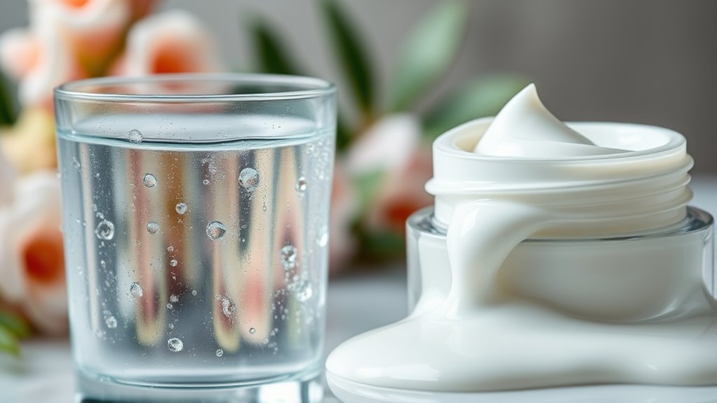 Understanding hydration versus moisturization is key to a balanced skincare routine. Hydration adds water to your skin cells, making your skin look fresh and plump, while moisturization seals in that water with barrier-forming ingredients to prevent loss. If you notice dullness or tightness, your skin may need more hydration. Conversely, dryness or flaky patches might require better moisturization. Keep exploring to learn how to optimize both for healthy, radiant skin.