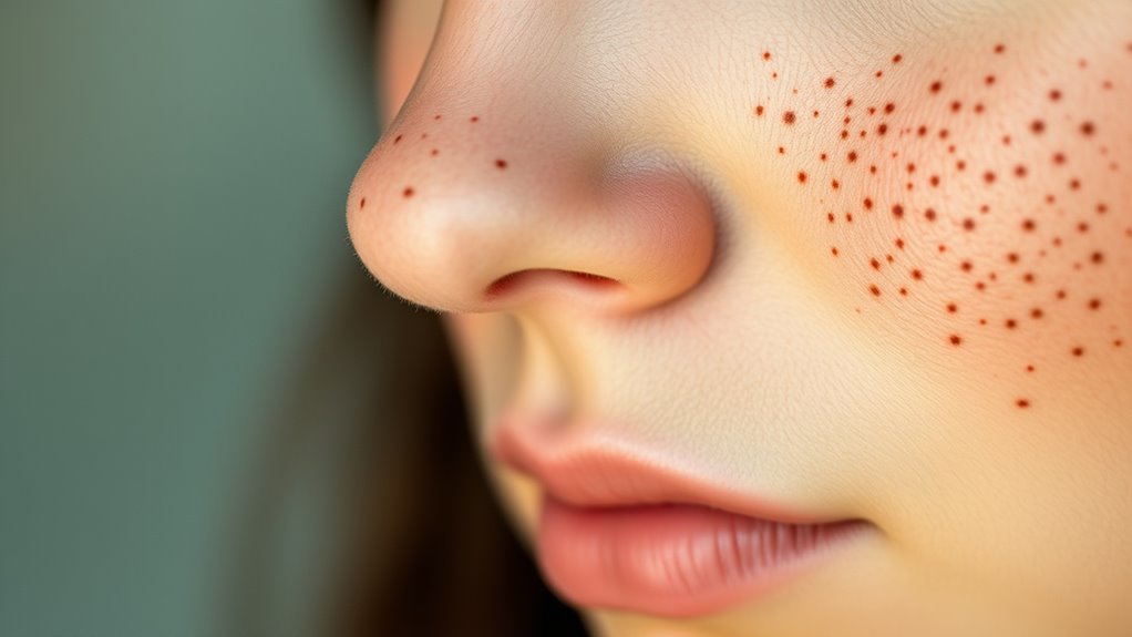 Faux freckles can be suitable for all skin tones if you focus on proper skin tone compatibility and freckle color matching. Lighter skin tones benefit from soft, brown or taupe shades, while deeper skin tones look great with richer, darker hues. To achieve a natural look, choose colors that complement your natural complexion, and blend well to guarantee your faux freckles blend seamlessly with your skin tone.