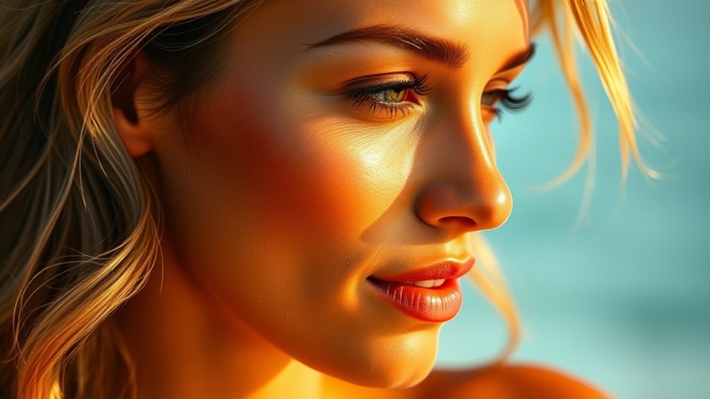 To keep your bronzed glow looking fresh and natural throughout the day, set your makeup lightly with a translucent powder if needed, and avoid heavy layering. Remember, the secret to a believable sun-kissed look is in the application tips—apply in natural light, use the right tools, and build gradually. With patience and practice, you’ll master how to enhance your natural beauty, achieving that effortless, radiant glow reminiscent of a perfect day in Saint-Tropez.