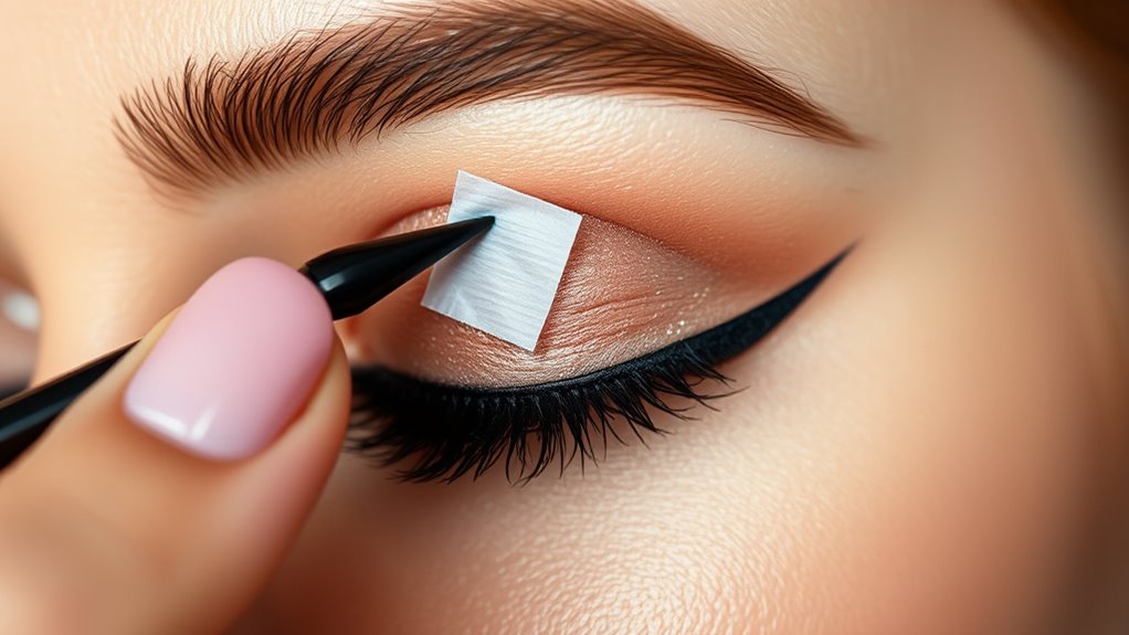Beim Entfernen von Klebeband sollten Sie darauf achten, keine Liner-Smudge zu verursachen, indem Sie es vorsichtig an einer Ecke zurückziehen. Wenn Sie Klebeband-Alternativen bevorzugen, verwenden Sie einen sauberen, schräg gehaltenen Pinsel, der in Make-up-Entferner getaucht ist, oder einen Wattestäbchen für Präzision. Diese Methoden helfen, Verschmierungen zu vermeiden und Ihren Lidstrich scharf zu halten. Nehmen Sie sich Zeit und ziehen Sie das Klebeband langsam ab, damit Ihr Wing scharf und makellos bleibt.