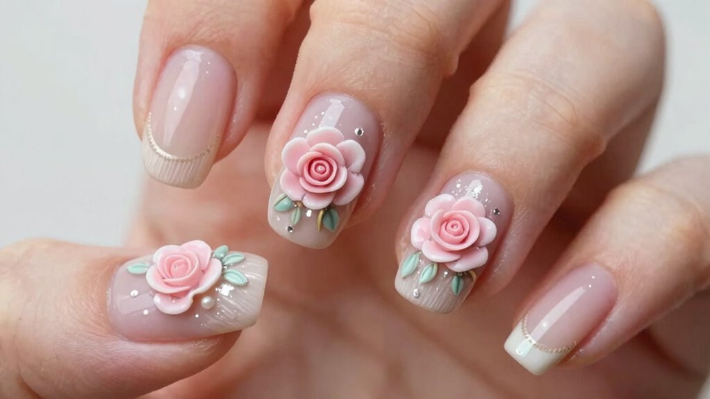 Think of your nails as a blank canvas; some surfaces hold 3D art better. You’ll find that nails with smoother textures, like gel or acrylic, are ideal for 3D designs. Gel nails offer flexibility, making intricate decorations easier, while acrylic provides a sturdy surface for heavier embellishments. If you want flawless 3D art, choose nails with even, smooth surfaces, and consider your preferred material to guarantee your design stays stunning.