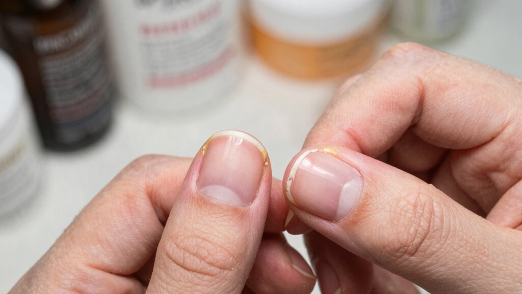 Certain medications can cause nail brittleness as a side effect. You should be aware that drugs like chemotherapy agents, antibiotics, or retinoids may impact your nails’ strength and flexibility. If you notice increased nail fragility after starting a new medication, talk to your doctor. They might adjust your dosage or suggest alternative treatments, helping you manage medication side effects and protect your nails from becoming brittle.