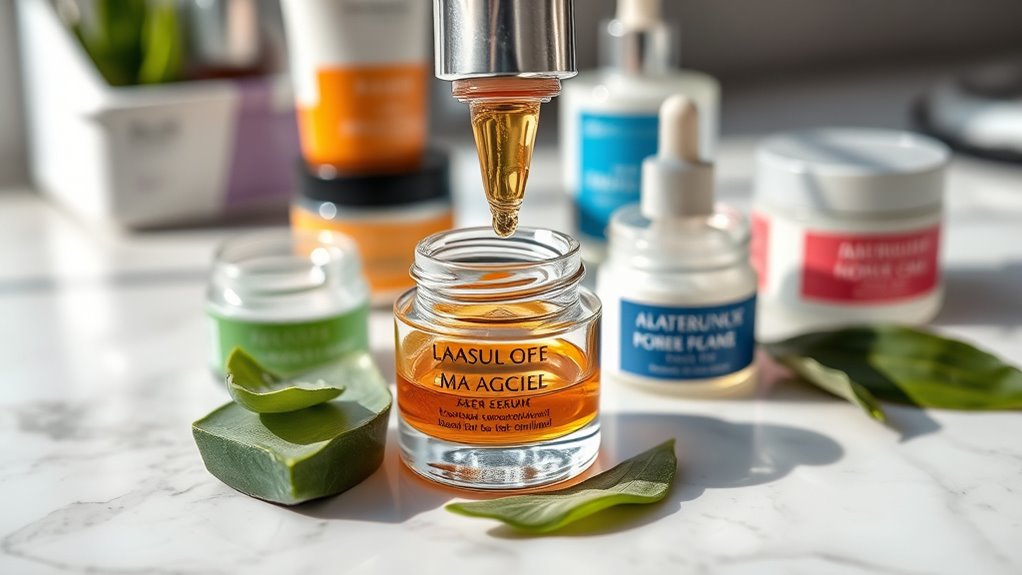 When you adopt skin cycling, your exfoliation routines become more strategic. Instead of daily scrubbing or harsh chemical peels, you focus on specific days for exfoliation—usually once or twice a week. This gives your skin time to recover between sessions, preventing excessive dryness or sensitivity. Gentle exfoliants, like mild acids or enzyme-based products, help slough off dead skin cells, revealing a brighter complexion and smoother texture. By scheduling exfoliation thoughtfully, you improve product absorption and encourage cell turnover without risking damage. Remember, over-exfoliating can damage your skin barrier, so sticking to a routine that respects your skin’s limits is essential. Incorporating space and organization into your routine can help you stay consistent and ensure you don’t skip or overdo steps, optimizing your skin health. Proper hydration strategies are equally essential in skin cycling. On days when you’re not exfoliating or applying potent actives, you should focus on replenishing moisture. This might mean using hydrating serums containing hyaluronic acid or glycerin, or applying rich moisturizers to lock in moisture. Proper hydration supports your skin barrier, making it more resilient to environmental stressors and the effects of active ingredients. When you cycle your products, you create a rhythm that allows your skin to rest and recover, which is fundamental for maintaining a healthy glow and preventing dryness or irritation. Incorporating hydration strategies thoughtfully ensures your skin remains plump, supple, and balanced throughout the week.