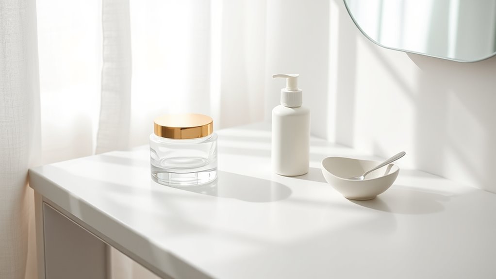 A minimalist skincare routine simplifies your daily regimen while still delivering effective results. Instead of cluttering your shelves with countless products, you focus on a few high-quality essentials that truly work for your skin. This approach not only streamlines your mornings and evenings but also encourages a more intentional, conscious choice in what you put on your skin. As you explore minimalist routines, you’ll notice an increased awareness of the importance of sustainable packaging. Many brands now prioritize eco-friendly materials, reducing plastic waste and minimizing environmental impact. Choosing products with sustainable packaging means you’re making a conscious decision to support brands that value the planet, aligning your skincare habits with your environmental values. It’s about more than just skincare; it’s a lifestyle shift towards sustainability. Along with packaging, ingredient transparency plays a vital role in minimalist routines. When brands openly share their ingredient lists and sourcing practices, you gain confidence in what you’re applying to your skin. Knowing exactly what’s in your products helps you avoid harmful chemicals and unnecessary additives, making your routine safer and more effective. Ingredient transparency also allows you to customize your skincare based on your unique needs, focusing only on ingredients that genuinely benefit your skin type or concerns. As you select minimalist products, you’ll find that transparency fosters trust and simplifies decision-making. Instead of sifting through countless labels and marketing claims, you can quickly identify products that align with your values and skincare goals. This clarity reduces the overwhelm often associated with traditional skincare routines, replacing it with confidence and simplicity. When choosing your essentials, look for brands that champion sustainability and transparency—these qualities reveal a commitment to quality and ethical practices. A streamlined routine doesn’t mean sacrificing efficacy. Instead, it emphasizes effective, multifunctional products that deliver results while respecting the environment and your skin’s health. Think of a gentle cleanser, a nourishing moisturizer, and a broad-spectrum sunscreen—each chosen with care and purpose. By focusing on fewer, better products, you minimize waste, reduce your exposure to potentially harmful ingredients, and foster a more mindful approach to self-care. Incorporating proper safety practices such as regular cleaning of your skincare tools and being aware of ingredient sensitivities further enhances your routine’s effectiveness and safety. Ultimately, a minimalist skincare routine rooted in sustainable packaging and ingredient transparency empowers you to take control of your skincare journey, making choices that benefit your skin and the planet alike. It’s about embracing simplicity without compromise, knowing that less truly can be more when you select thoughtfully crafted products.