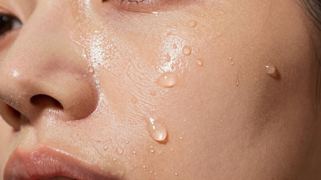 Lack of moisture triggers your skin to produce more oil as a natural defense mechanism. When your skin isn’t properly hydrated, it interprets dryness as a threat, prompting an increase in oil production to compensate. This excess oil can clog pores and create a breeding ground for breakouts. Paradoxically, by under-moisturizing, you signal your skin to produce even more oil, which worsens oily skin issues. Proper skin hydration helps maintain the skin’s balance, reducing the need for your glands to overproduce oil. When your skin stays adequately moisturized, it feels less dry and less prone to producing excess oil. Additionally, understanding the importance of indoor humidity levels can help you maintain optimal skin hydration and overall skin health. Maintaining appropriate skin barrier function is essential for preventing moisture loss and supporting skin resilience. Recognizing the role of hydration and skin health can further empower you to develop an effective skincare routine that promotes balance and clarity. Besides external factors, personal skincare habits influence how well your skin retains moisture and stays balanced. For example, using gentle cleansers that do not strip natural oils supports your skin’s ability to retain moisture effectively.