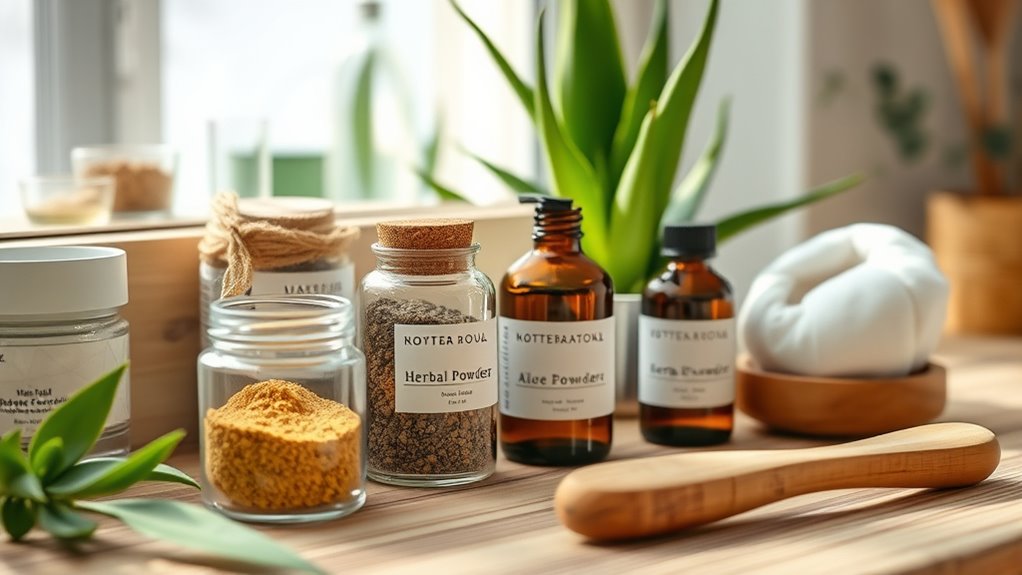 To build a non-toxic beauty routine, opt for products with natural, plant-based ingredients like aloe vera or jojoba oil that nourish your skin without harmful chemicals. Always check ingredient labels for transparency and avoid synthetic irritants. Choose eco-friendly packaging and support brands committed to sustainability. Many small brands offer effective, luxurious alternatives that align with your health and environmental values. Keep exploring to discover simple ways to elevate your skincare with safer, greener options.