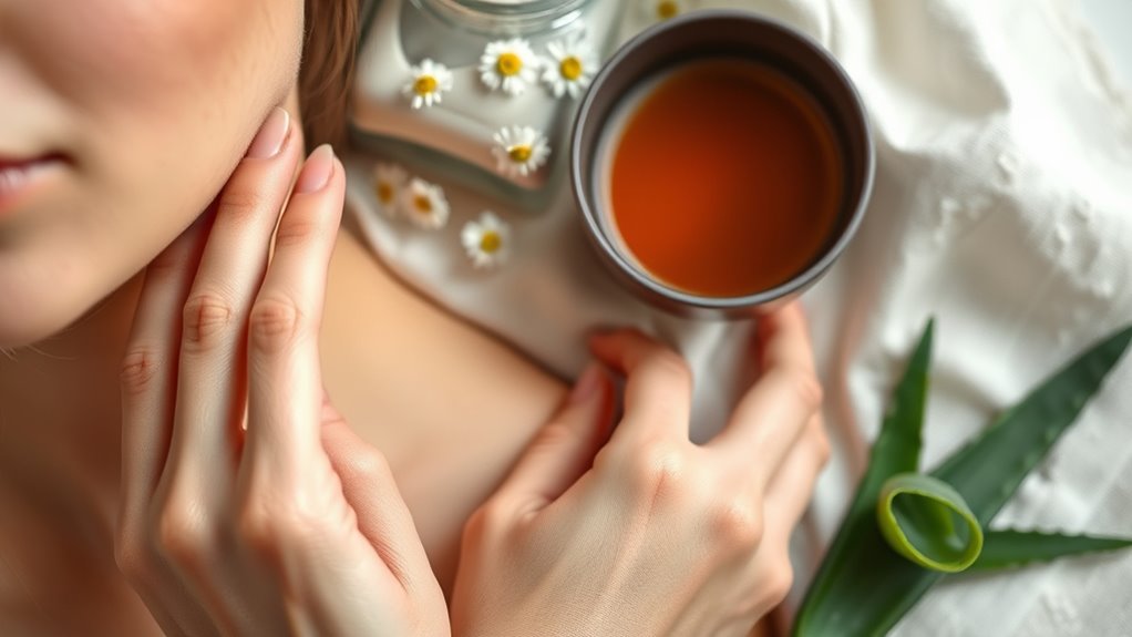 To manage sensitive skin, identify your triggers like harsh products, fragrances, or extreme weather. Use gentle routines with lukewarm water and mild cleansers, and include natural remedies such as chamomile or aloe vera to soothe irritation. Keep a skincare journal to track your reactions and introduce new products gradually. Conduct allergy testing to personalize your routine, and always patch-test new remedies. Discovering what works best can help keep your skin calm and healthy, so continue exploring solutions tailored to your skin’s needs.