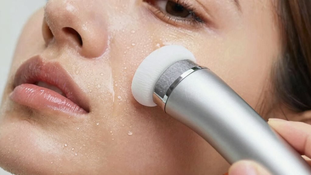 For ultrasonic skin scrubbers to work best, your skin needs to be properly damp with moisture. You should splash your face with lukewarm water or use a hydrating toner before using the device. Damp skin helps vibrations penetrate deeper and lifts dirt and dead cells more effectively. If your skin is dry, the device won’t glide smoothly or clean as thoroughly. Keep going, and you’ll discover more tips to maximize your skincare routine.