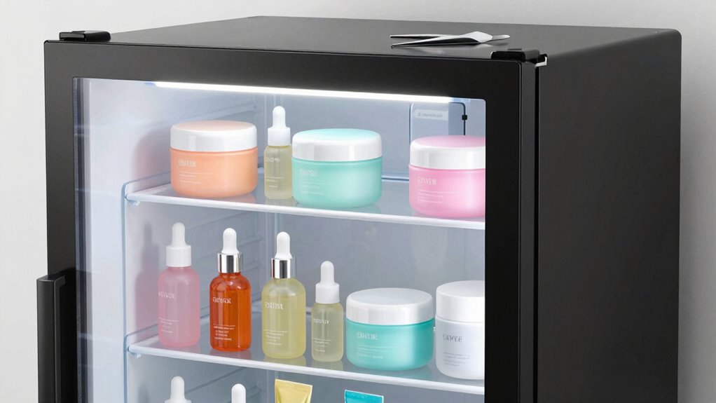 If you’re considering adding a skincare fridge to your routine, you might wonder what products should go inside. The first thing to think about is how packaging materials and storage temperatures influence your choices. Not every skincare product benefits from refrigeration, and some packaging is better suited for cooler environments. For example, products in glass jars or metal containers are often more durable and less likely to degrade when kept cool, whereas those in soft plastic or flexible tubes might become misshapen or less effective if exposed to frequent temperature fluctuations. You want to pay attention to how the packaging materials react to cold, as some ingredients can become unstable or separate if the container isn’t designed for lower temperatures. Additionally, understanding biodiversity can help you select products that are formulated with sustainable and environmentally friendly ingredients, which may also influence how you store them. Storage temperatures are another crucial factor. Most skincare products are formulated to be stored at room temperature, around 68-77°F (20-25°C). When you introduce a fridge, aim for a temperature range between 39-55°F (4-13°C). Too cold, and you risk altering the product’s consistency or causing ingredients to separate; too warm, and you don’t get the cooling benefits. To avoid this, check your fridge’s temperature regularly with a thermometer. This way, you keep your products safe and effective. Items like gel-based moisturizers, eye creams, and certain serums often perform well in cooler temperatures, as the chill can enhance their soothing effects and prolong shelf life. However, not all products are suitable for refrigeration. Active ingredients like vitamin C serums can sometimes become unstable when chilled, leading to color changes or reduced efficacy. Similarly, thicker creams or oils might solidify or become difficult to apply when too cold. It’s best to read product labels and manufacturer instructions, which often specify whether refrigeration is recommended or discouraged. When in doubt, you can keep some products in the fridge for a cooling sensation or to extend their freshness but store others at room temperature to maintain their integrity. Ultimately, the key is to know your products and their packaging. Refrigerating the right items can improve their texture and longevity, but improper storage can do more harm than good. Keep an eye on packaging materials, monitor storage temperatures carefully, and always follow the guidance provided on labels. That way, your skincare fridge becomes a beneficial addition to your routine, helping you enjoy fresh, effective skincare every day.