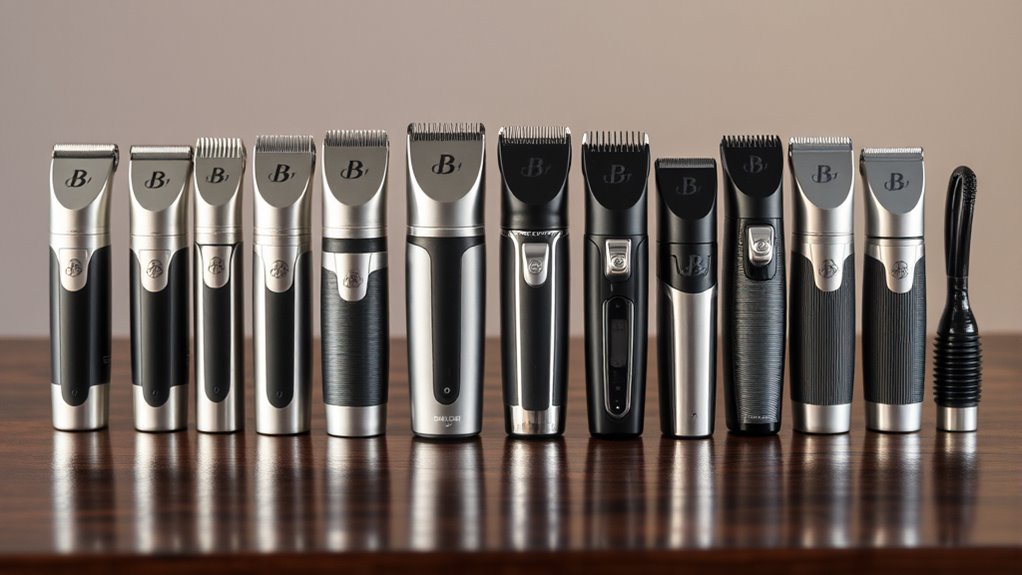 Adjustable length settings are essential for customizing your grooming routine and achieving the desired beard style. They provide a range of cutting lengths, often from 0.5mm to 20mm or more, reducing the need for multiple attachments. Most trimmers feature a dial, zoom wheel, or digital controls, making it easy to switch between lengths during grooming. Lockable settings prevent accidental adjustments, helping you maintain consistency. A higher number of options offers greater versatility, whether you’re aiming for stubble, a full beard, or detailed designs. Precise length control is vital for maintaining symmetry and achieving a professional look without additional tools. Overall, adjustable length settings give you the flexibility to tailor your grooming experience to your specific style preferences.