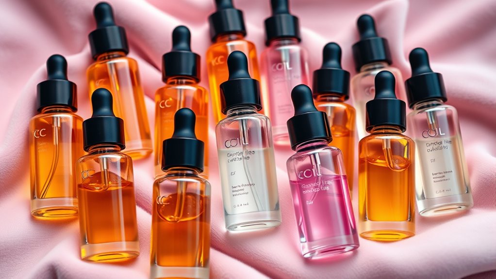 When evaluating cuticle oils for their hydration benefits, it’s essential to look closely at their ingredients and formulation. I focus on oils that contain proven hydrating agents like vitamin E, jojoba oil, or almond oil, which provide deep, long-lasting moisture. I also check how well the product absorbs—preferably fast-absorbing, non-greasy formulas that hydrate without leaving a residue. Natural humectants and emollients are important because they attract and lock in moisture, ensuring sustained hydration. User feedback and clinical claims help gauge effectiveness in reducing dryness, cracking, and peeling. Ultimately, I consider the recommended application method and frequency; consistent use with targeted application maximizes hydration retention. Combining these factors helps me select cuticle oils that truly nourish and strengthen.
