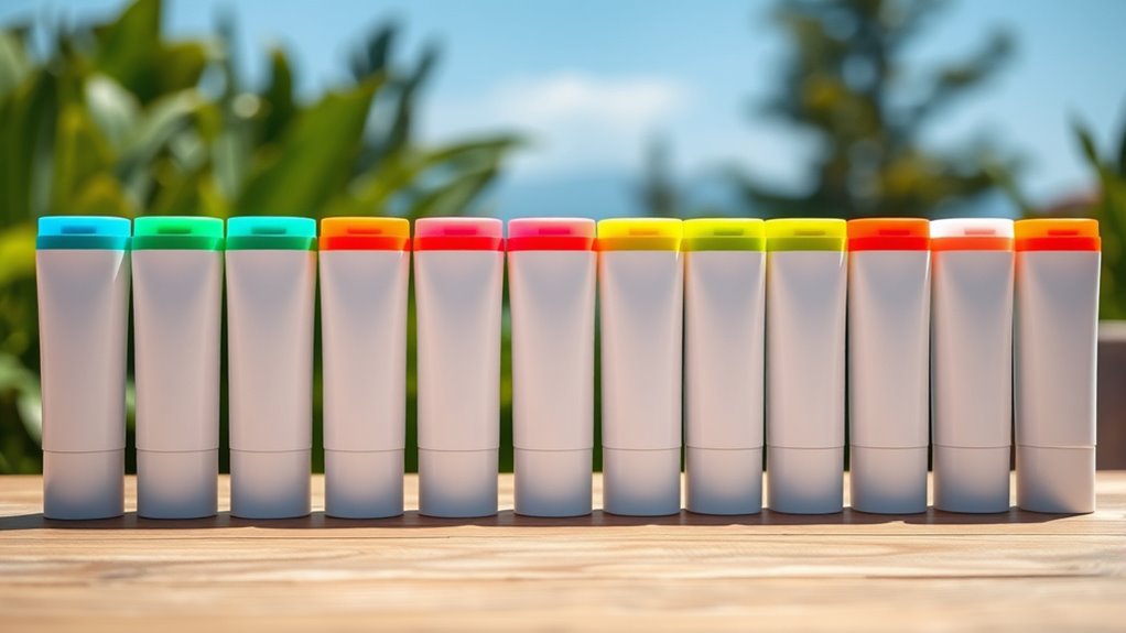 The formulation type of a sunscreen stick directly impacts how it feels on your skin, how often you’ll need to reapply, and its suitability for sensitive skin. Mineral sticks contain zinc oxide or titanium dioxide, providing broad-spectrum protection with a natural barrier that reflects UV rays. They’re often ideal for sensitive or reactive skin because they tend to cause fewer irritations. Chemical sticks, on the other hand, absorb UV rays and convert them into heat, requiring proper formulation to prevent irritation and ensure effective protection. Some sticks combine mineral and chemical filters for enhanced coverage, but pure mineral formulations are generally better for delicate skin. The choice also affects texture, white cast, reapplication frequency, and environmental impact, so consider your skin sensitivity and activity level when selecting a formulation type.